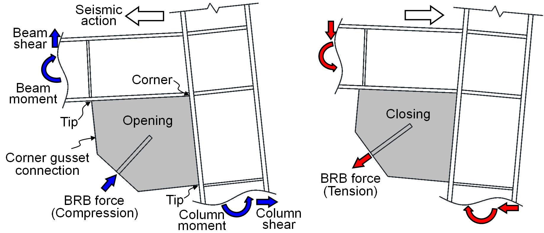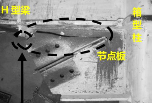 防屈曲支撑(BRB)是一种可实现钢材轴向拉压屈服的高效消能减震装置[1],可有效减轻主体结构在强震下的地震损伤。BRB与钢框架结构需通过节点板进行连接,节点板与梁柱之间采用焊缝连接。为保证BRB与结构之间的可靠传力,需确保节点板在大震下基本保持弹性。然而,地震下梁柱的剪力会引起钢框架节点产生附加开合变形(见图1),因此节点板不仅承受由BRB轴力而引起的支撑力效应,还需额外承担由节点变形引起的附加开合效应。以往研究表明,这种强烈的平面内相互作用往往造成节点板先于BRB发生失效,容易在连接边处出现开裂或断裂现象(图2和图3)[2,3],导致BRB被迫提前退出工作,无法充分发挥BRB的结构保险丝功能。